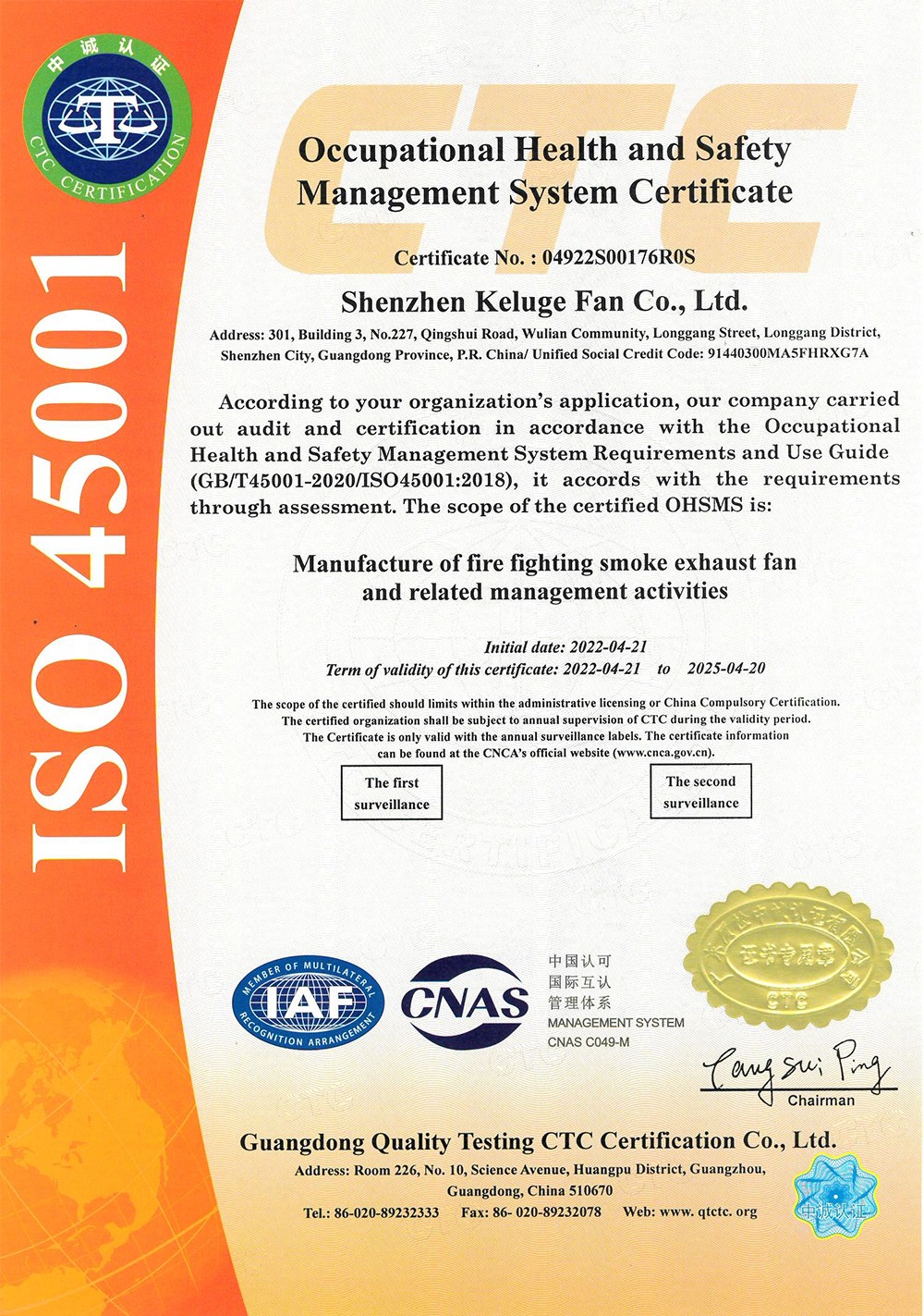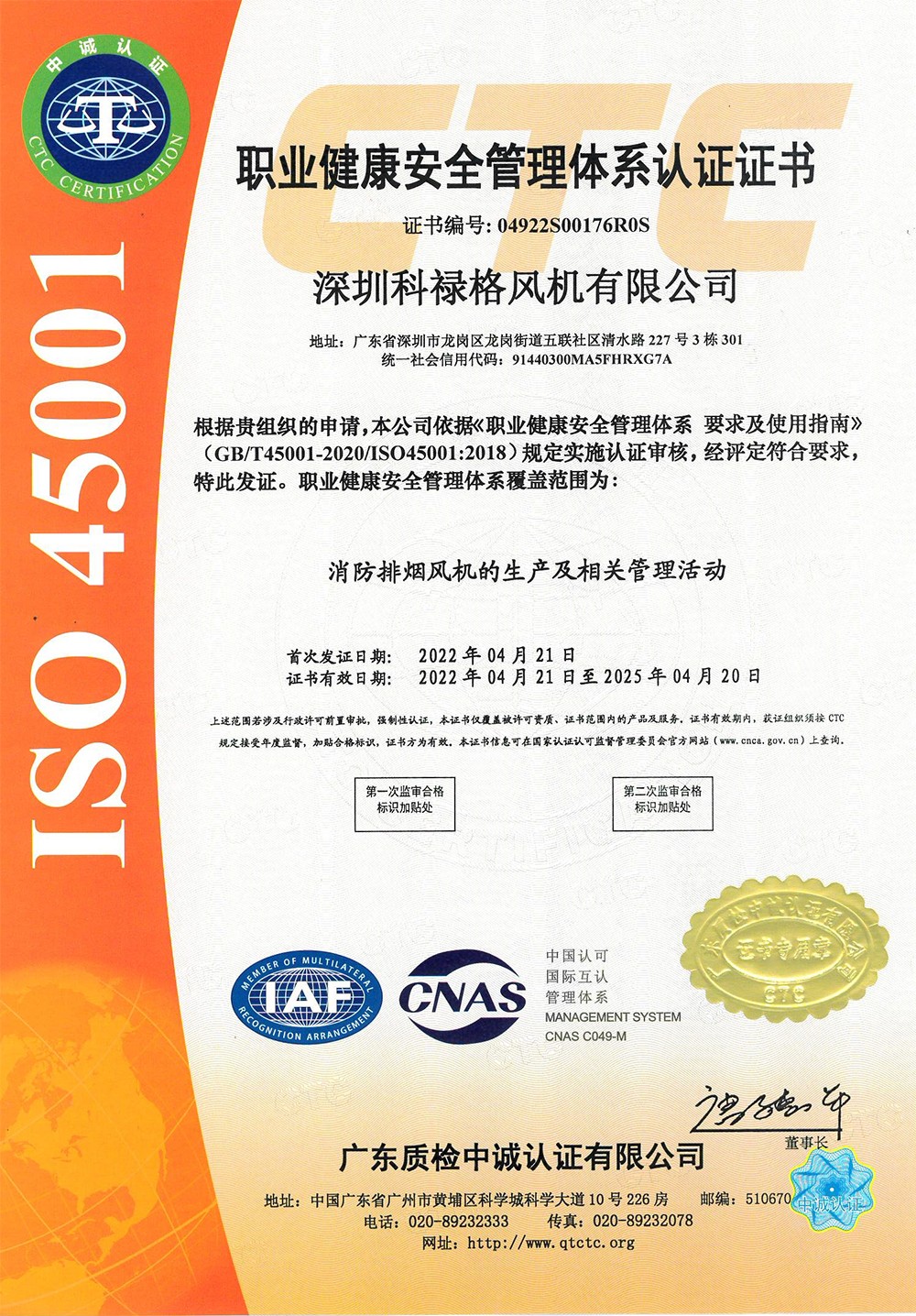 职业健康安全管理体系认证证书